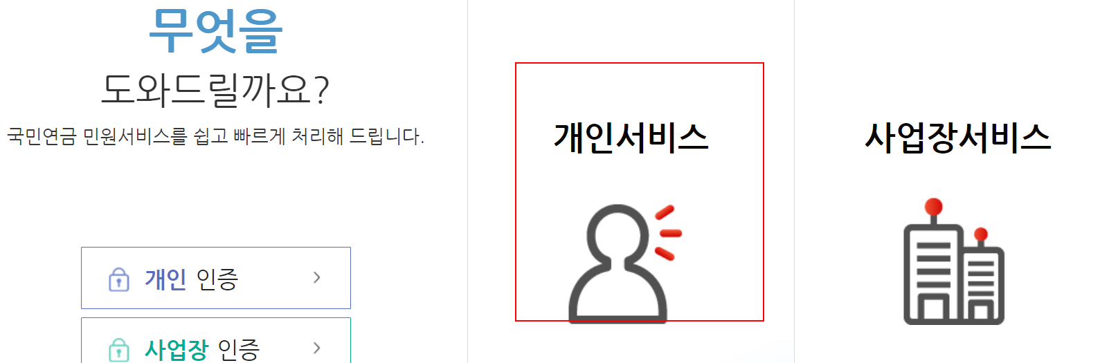 무엇을 도와드릴까요? 라고 나오게 되는데요. 개인서비스 선택하시고 넘어가주시면 되요 여기서부터 우리는 국민연금에 관련되 다양한 것들을 보고 받을수가 있어요.