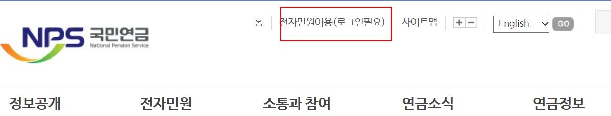 국민연금 가입증명서 발급 위한 홈페이지 이동이후 메뉴 선택해야하는데요. 이때 가장 상단에 홈 바로 옆에 있는 전자민원이용 부분을 선택해주어야 합니다.