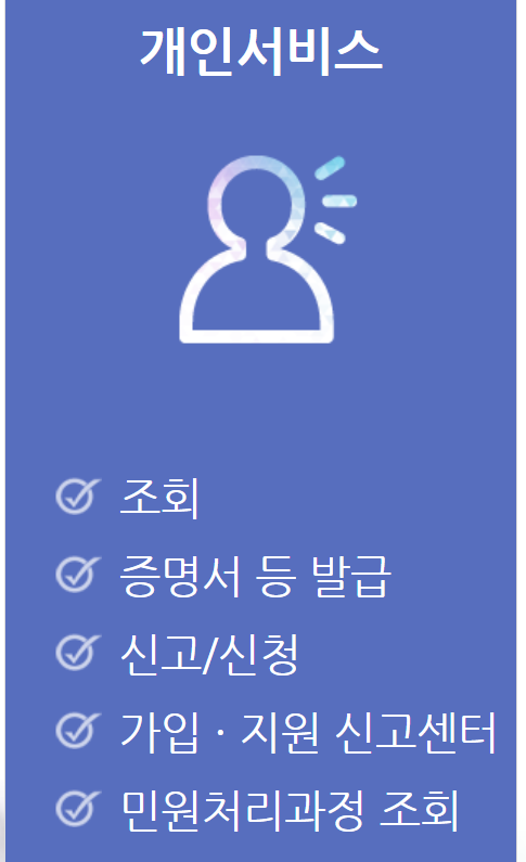 이곳은 당연히 공동인증서를 통한 로그인을 해주어야지만 가능합니다. 그리고 한가지 더 말할 것은 우리는 개인서비스를 이용해서 할수가 있다라는 부분입니다.
