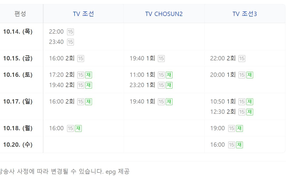 추가적으로 내일은 국민가수 재방송 편성표를 보는 곳을 알려드려볼까 합니다. 많은 도움이 되시면 좋겠습니다. 일단 기본적으로 티비조선 및 조선2, 조선3 체널에서 보실수가 있는데요.