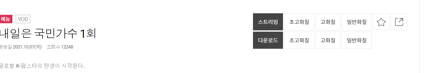내일은 국민가수 보시면 스트리밍, 다운로드 두가지 메뉴로 나뉘고 그리고 초고화질, 고화질, 일반화질로 나누어서 볼수가 있습니다.