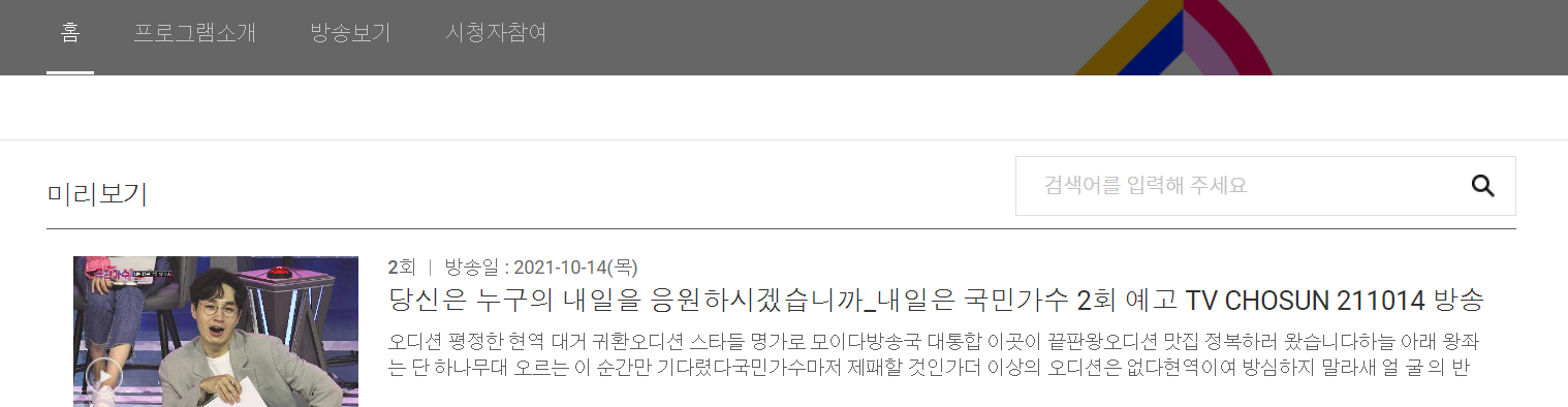 일단 홈페이지는 내일은 국민가수라는 타이틀 로고를 쓰면서 당당하게 있습니다. 홈, 프로그램소개, 방송보기, 시청자참여 메뉴가 있고 각각 세부적인 정보들이 있어요.