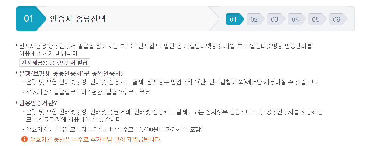 재발급에 필요한 메뉴 선택권입니다. 이용자 ID가 있고 그리고 등록번호 그리고 인증서 구분하여 발급을 선택할 수가 있습니다. 그리고 범용 인증서 경우 4400원이 소요가 됩니다.