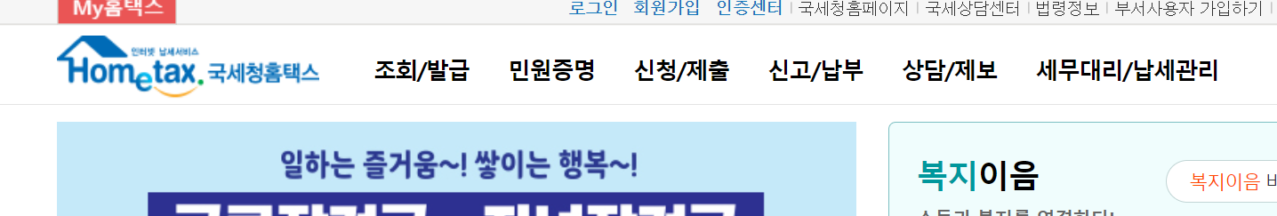 홈택스로 이동하게 되면 실제로 이런 모습을 볼수가 있습니다. 그러면 가장 위에 있는 메뉴 중 하나인 조회/발급 부분을 선택하여 주세요.
