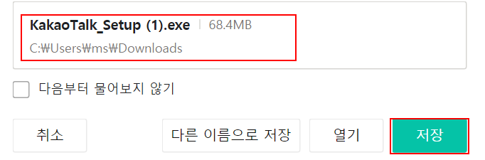 그러면 카카오톡 PC버전 설치 파일이 다운로드됩니다. 용량이 68MB 면 정상적인 파일일 거예요. 물론 전 미리 받아서 테스트해보았고 다운로드된 파일 실행을 하고 동의만 하면 설치가 완료됩니다. 인증하는 방법은 추후 다시 글을 쓰도록 하겠습니다.