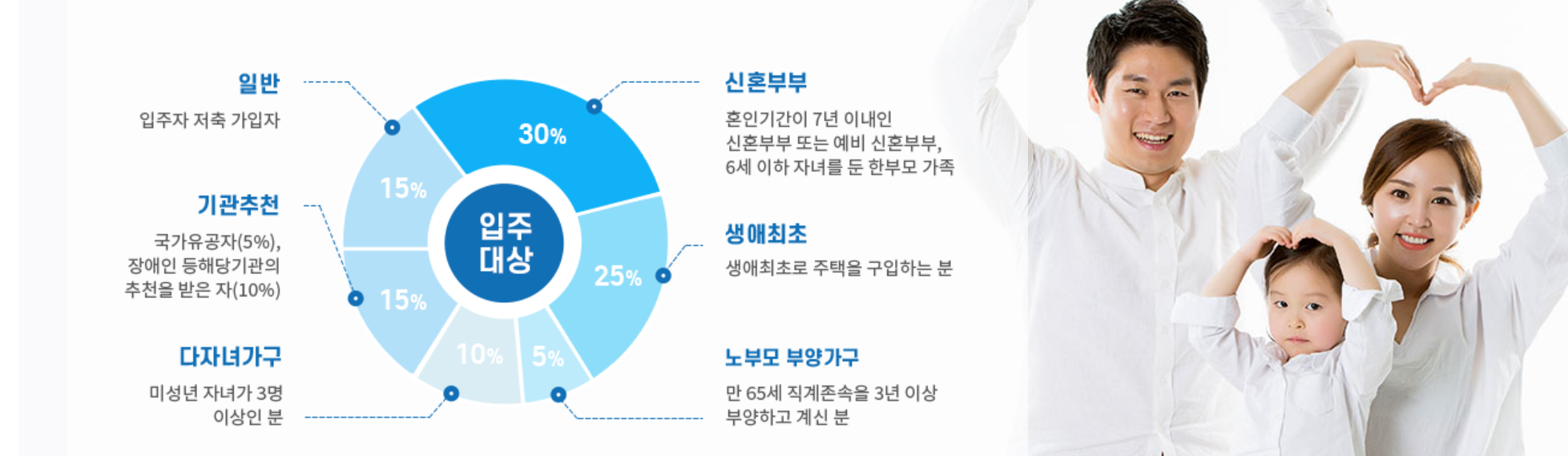 신혼부부 30%, 생애최초 25%, 노부모 부양가구 5%, 다자녀 가구10%, 기관추천15% 일반 15% 이렇게 분배 됩니다.